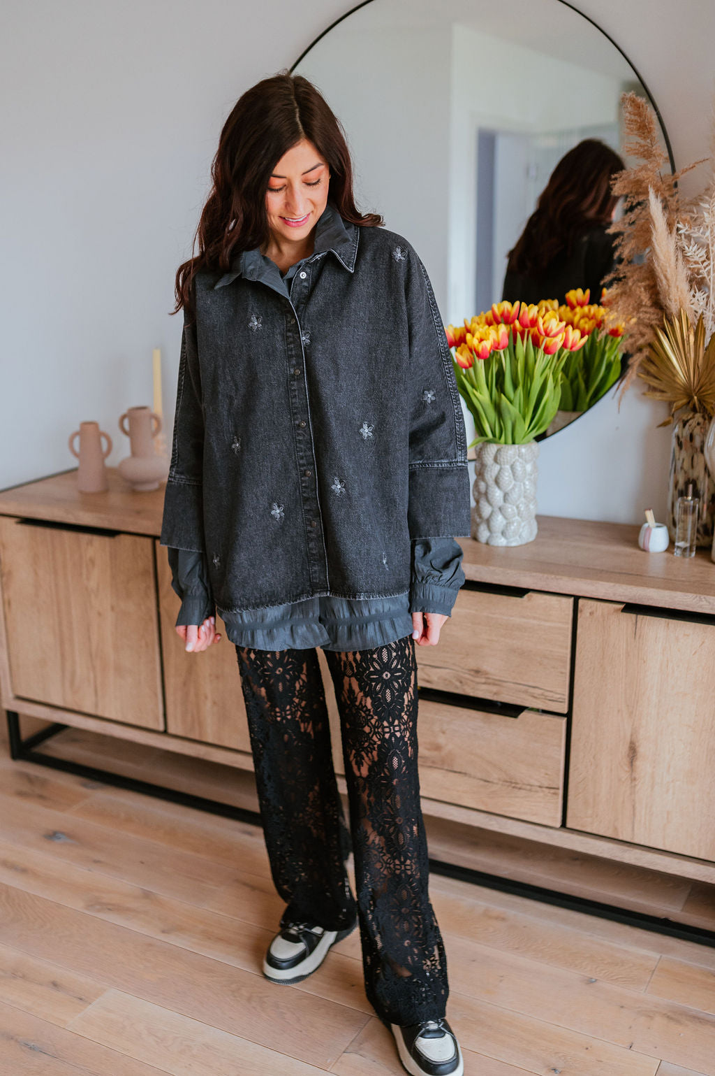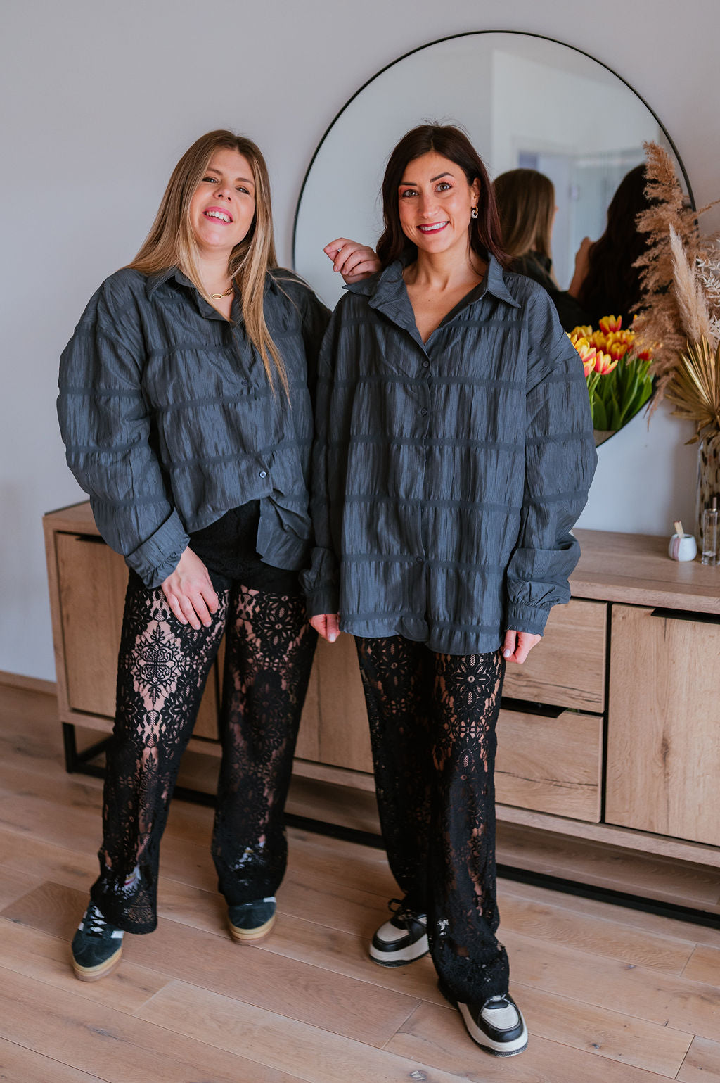Nadia wears size L, usually corresponds to a 42.